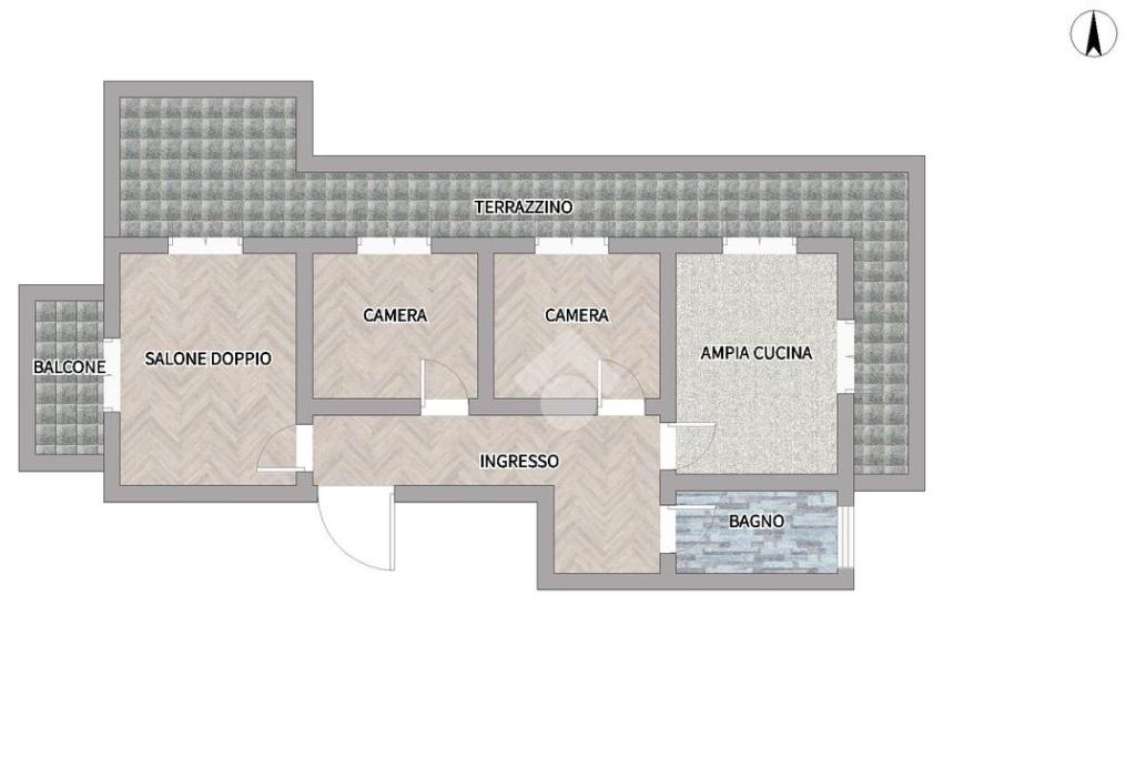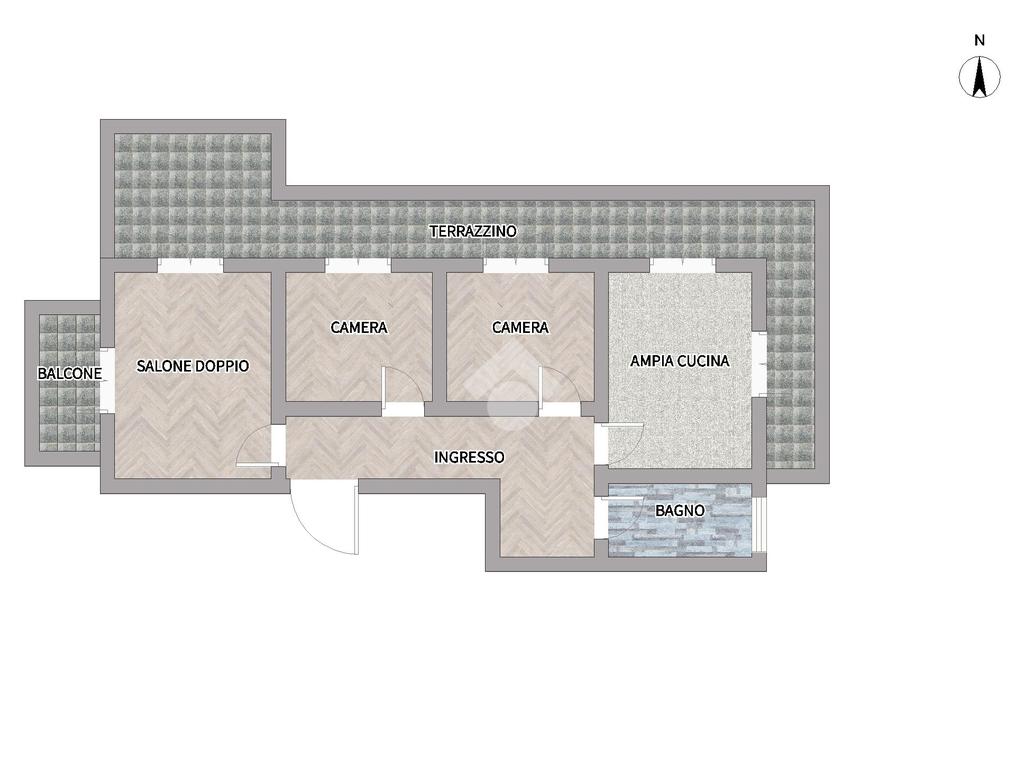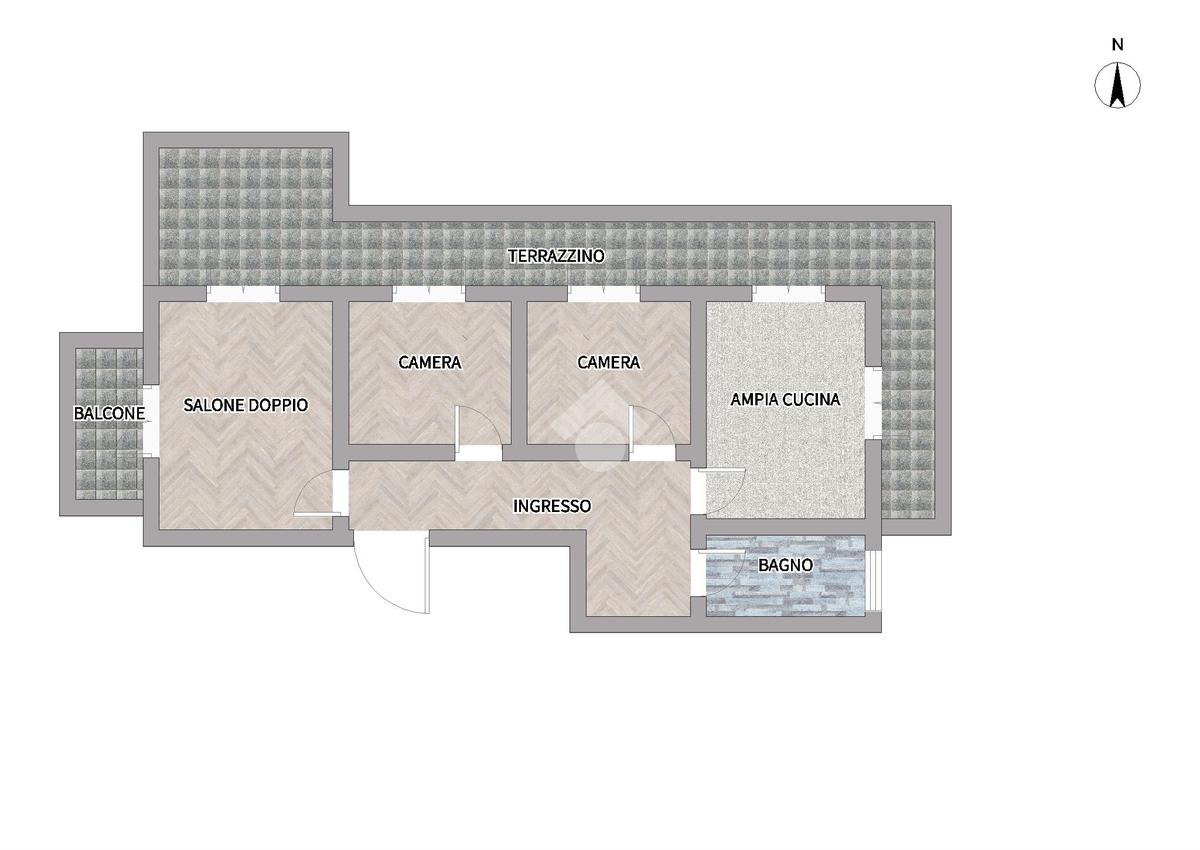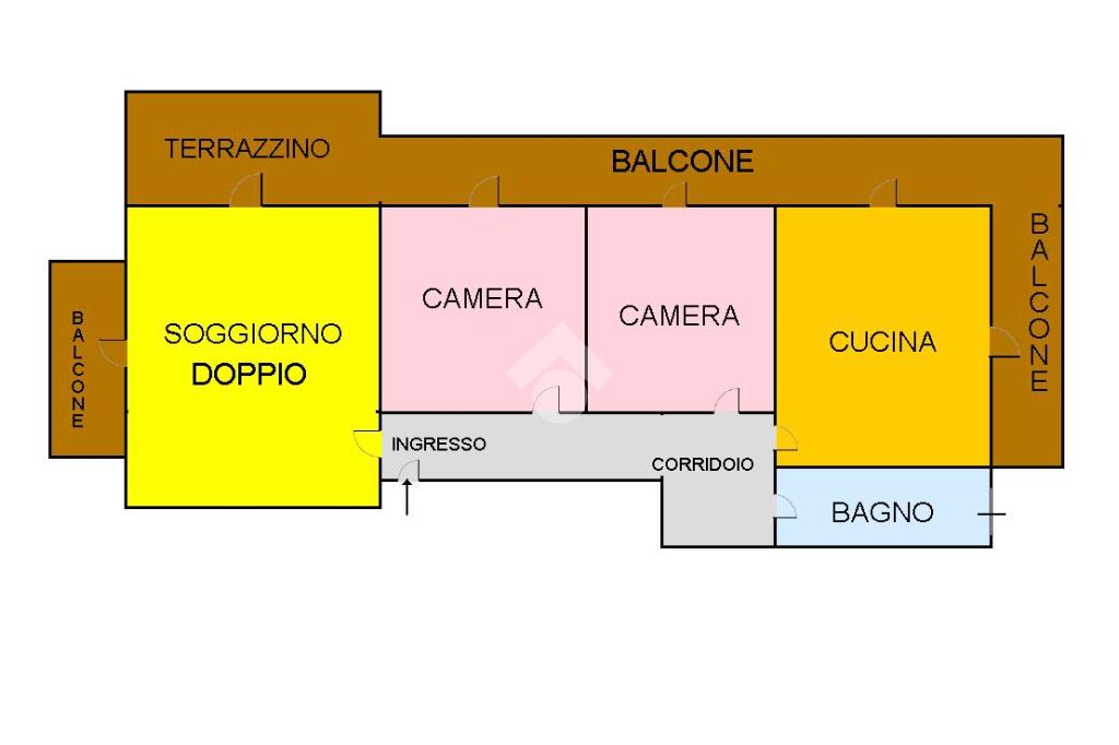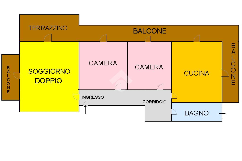 ingresso, salone doppio,due camere da letto,cucina abitabile e bagno.
