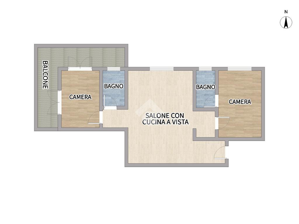 La distribuzione degli spazi è funzionale e ben organizzata, composta da: ingresso, luminoso soggiorno con cucina a vista, due camere da letto e due bagni