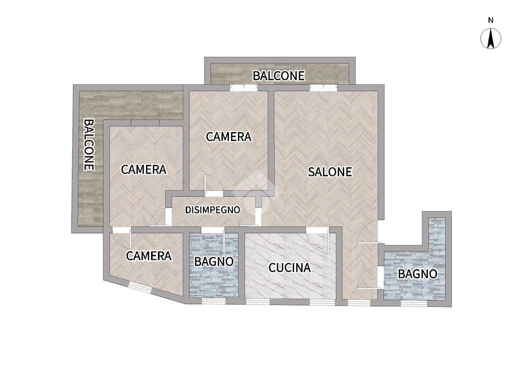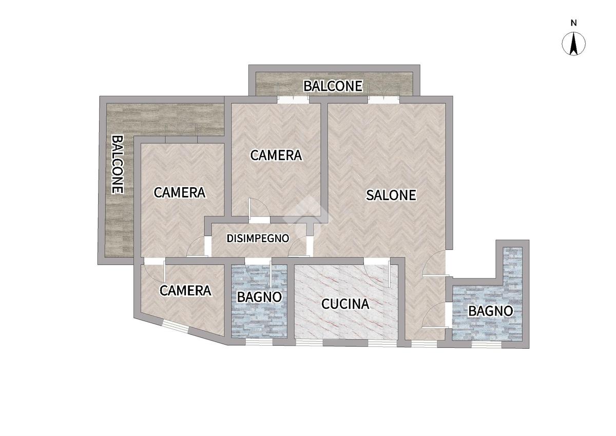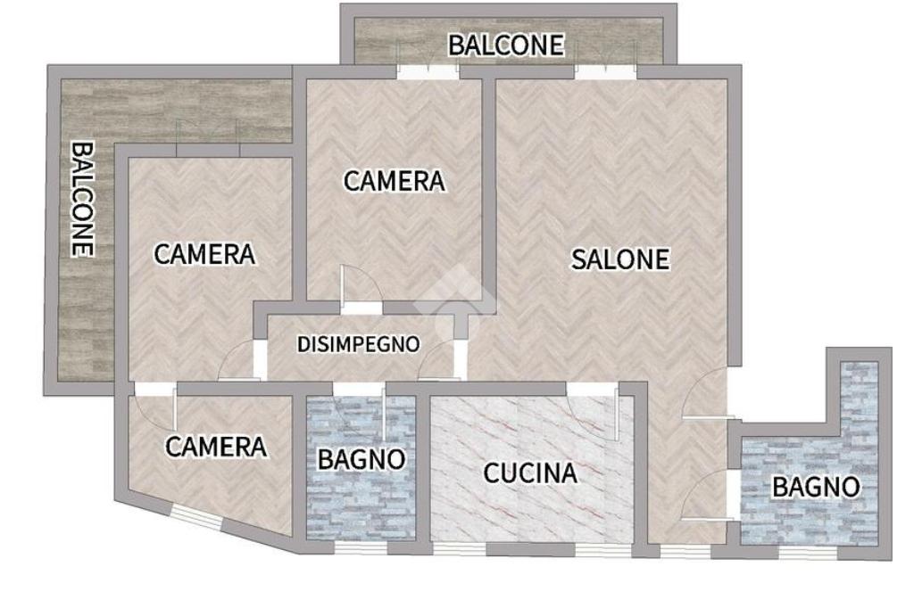 La distribuzione interna si compone di: ingresso in disimpegno, luminoso soggiorno, cucina abitabile, due camere da letto, una cameretta, doppi servizi e comodo ripostiglio.