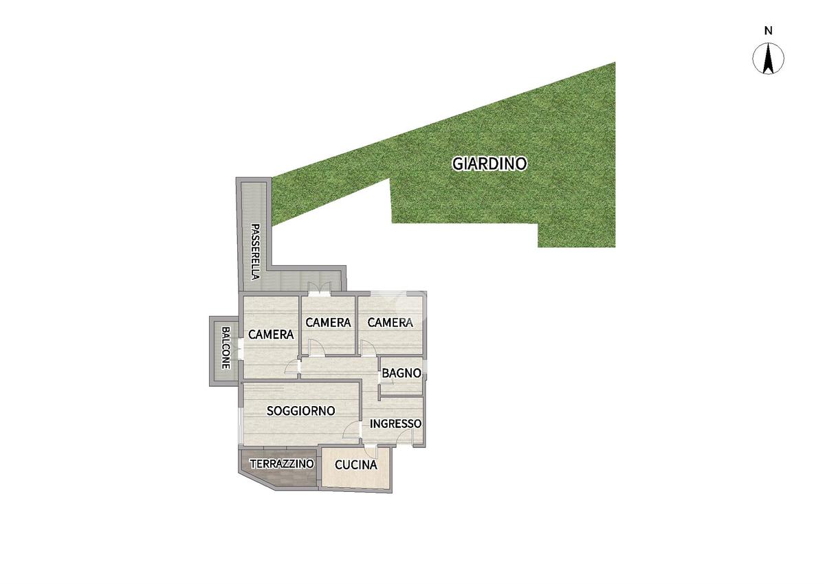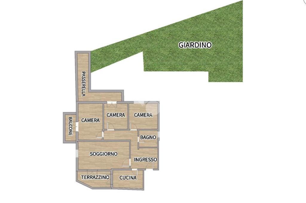 L’immobile gode di tripla esposizione grazie a tre balconi, di cui: uno terrazzato ed uno che funge da passerella con accesso al giardino privato, in parte pavimentato e in parte giardinato.