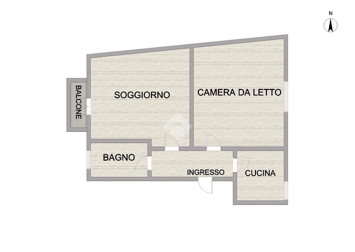 Composizione interna: ingresso accogliente, soggiorno luminoso, 1 camera da letto, cucinotto funzionale e bagno.
